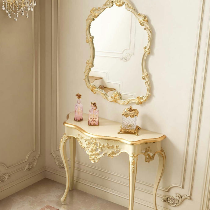 Experience the refined beauty of the Aurora Charm Hand-carved Console, where delicate proportion meets rich heritage. Crafted from select hardwood and finished in a soft ivory lacquer, the console’s narrow frame is both elegant and functional—perfect for contemporary classic or Neo-Classical interiors. The hand-carved embellishments—graceful scrolls and floral motifs—are further elevated with gold leaf highlights, delivering a luminous accent that interacts beautifully with ambient light.