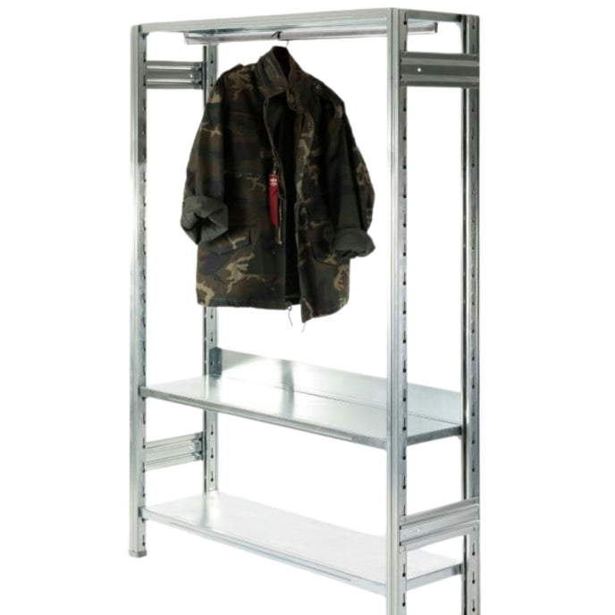 Functional Garment Presentation — Includes a horizontal clothes rail atop sturdy shelving, blending display with storage.