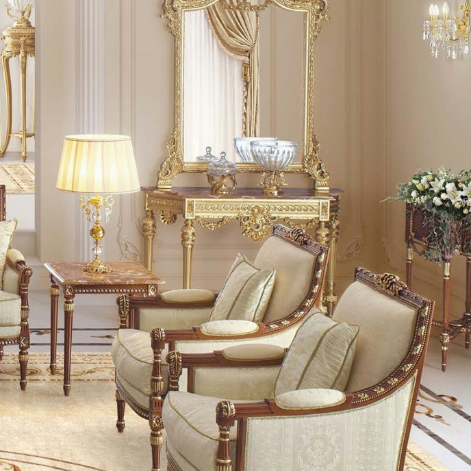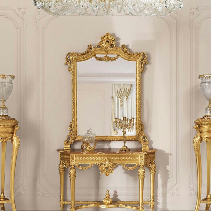 Elevate your interiors with the Elite Shaped Mirror—a breathtaking fusion of Italian artisanry and bold design. Encased in a solid wood frame, every contour is meticulously finished in full gold leaf, granting the surface a radiant, opulent sheen that delights the eye.