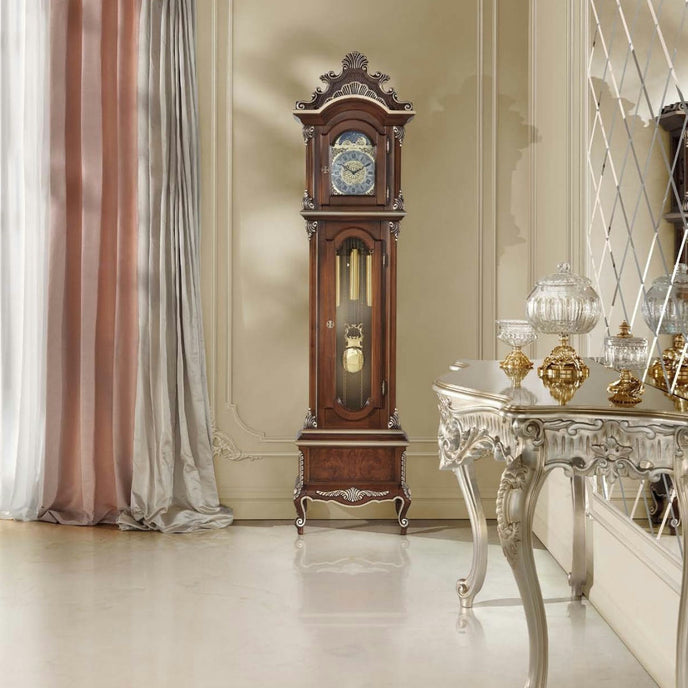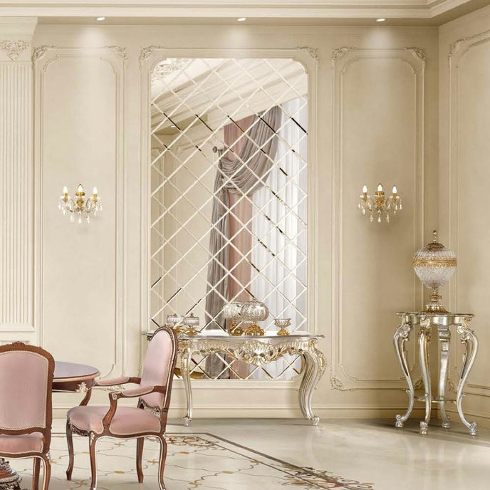 Elevate your interiors with the Noble Etiquette Grand Wall Mirror, a masterpiece of Italian craftsmanship that fuses Baroque grandeur with timeless refinement. The frame is meticulously carved from premium hardwood, then hand-finished in shimmering silver leaf to accentuate every curve and flourish. Its ornate detailing—featuring floral garlands, scrolls, and regal crest motifs—embodies the artistry of centuries-old furniture-making traditions.